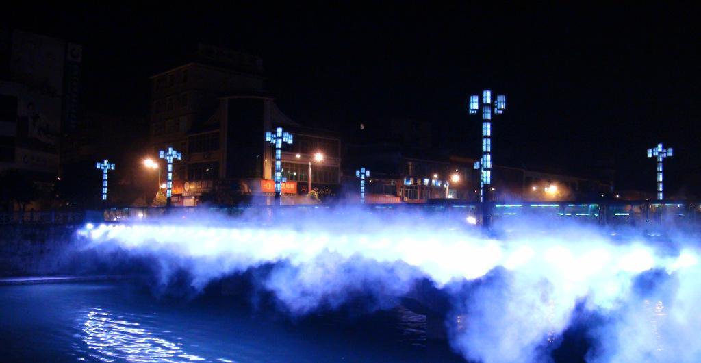 水幕霧森,就是以自然的發生方式,通過高壓系統,促進水的運動,再通過高壓作用,使帶電的微小水滴分裂為表層帶負電、內層帶正電,帶負電的水滴表層和空氣中的原子或分子結合,即形成負離子;較重的水滴內層則在重力作用下下沉,因而可以在空氣中獲得大量的負離子, 形成頗似自然霧氣的白色水霧,猶如“霧的森林”。這是一種新技術高科技產品。它以改善空氣質量,美化環境為依托,以景觀、保濕、防塵、降溫、造景為目的,在自然園林、環境景觀、舞美等方面應用廣泛。