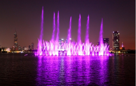 音樂噴泉隨著音樂變換,為城市的人們在夜間增添一份美輪美奐的視覺和聽覺的盛宴,是快節(jié)奏的城市生活夜間一項頗為浪漫閑適的娛樂項目。