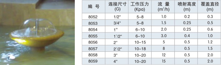 此噴頭噴出水膜均勻,形似蘑菇,晶瑩透明,水體柔和優雅。適合室內外園林假山,室內休閑場所景觀水景及室外景觀雕塑噴泉等,是最常用的水景噴頭之一。具有耗水量少,不需要大功率的噴泉泵即能出很好的噴水效果。