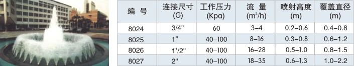 此噴頭噴水時水流自扁平的噴嘴噴灑形成扇形水膜,一般以組合造型為主。該噴泉噴頭組合圖形優美,變化多端。組圖能力很強,常用于酒店別墅等場所,也很適合安裝在一般的小水池中,燈光效果好,水聲音小因而廣泛安裝和使用。 產品效果圖及參數表: |