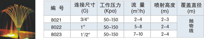 此噴頭噴水造型猶如鳳尾而得名,水流舒展柔媚,常用于特色組合噴泉。 產品效果圖及參數表: |