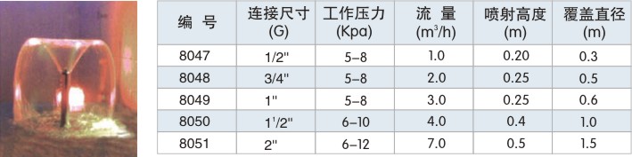 該噴泉噴頭噴出的水膜均勻,形似牽牛花,晶瑩透明,水體柔和優雅。適合室內外園林假山、室內休閑場所景觀水景、室外景觀雕塑景觀噴泉等,是最常用的水景噴頭之一。