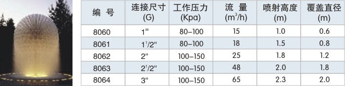 此噴頭噴水時在陽光的光照下,酷似水晶寶石,可獨立成景,也可組合成景,銀光閃閃,氣勢壯觀,噴水效果似水晶球。此噴頭對水質要求高,必須裝過濾網,水晶半球通常安裝在水面上,半單獨或和其他噴頭組合成景,燈光效果好。