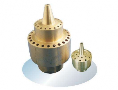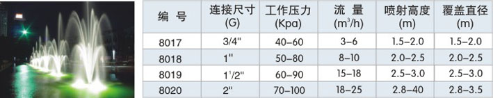 此噴頭由中心直上合兩圈不同層次及角度圓孔組成,噴射形成中心水柱和兩層外向拋射的拋物線狀水花,是噴泉噴頭中常用的噴頭之一。該噴頭可以選擇不銹鋼或者黃銅材質(zhì)制作,產(chǎn)品規(guī)格齊全。