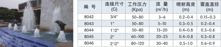 此噴頭噴水時(shí)將空氣吸入形成水氣混合的白色膨大的水體,像股泉水從噴眼噴涌而出水面,寄意財(cái)富滾滾而來(lái)。 產(chǎn)品效果圖及參數(shù)表: ![]() |